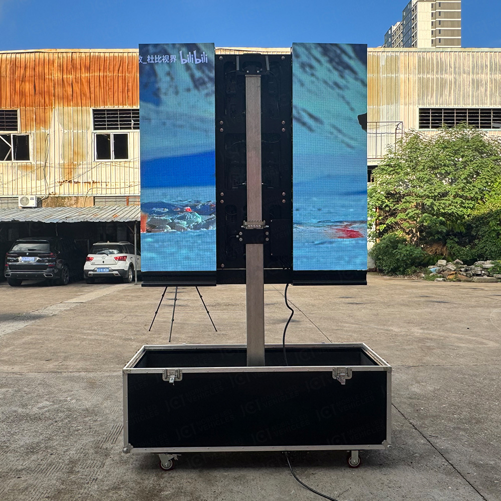 3.180 degrees Folding Design: The dual screens fold 180 degrees freely, offering a wide-angle coverage with no blind spots when fully extended. They can be swiftly folded into an flight case, significantly saving storage and transportation space while enhancing flexibility in venue adaptation. 1000mm Height Adjustment: The screens support 1000mm vertical movement, allowing precise height adjustment for any scenario — whether for standing spectators at outdoor concerts or seated attendees at open-air forums, they provide optimal viewing angles to prevent visual obstruction and enhance the overall experience.