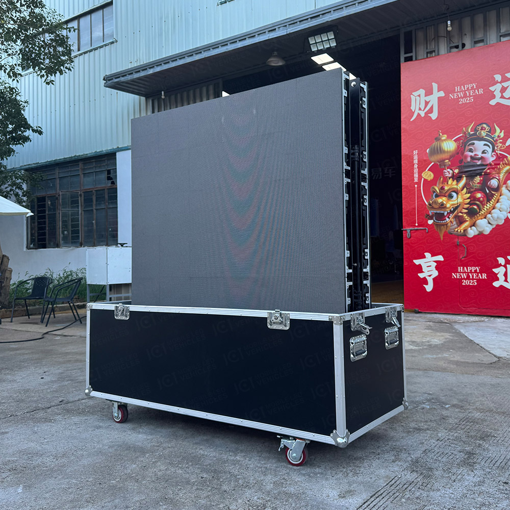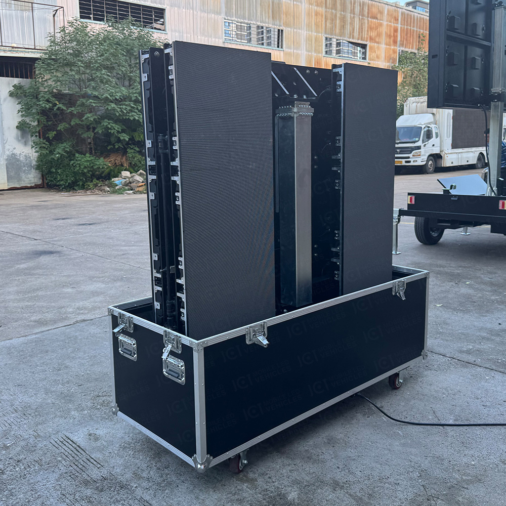 3.180 degrees Folding Design: The dual screens fold 180 degrees freely, offering a wide-angle coverage with no blind spots when fully extended. They can be swiftly folded into an flight case, significantly saving storage and transportation space while enhancing flexibility in venue adaptation. 1000mm Height Adjustment: The screens support 1000mm vertical movement, allowing precise height adjustment for any scenario — whether for standing spectators at outdoor concerts or seated attendees at open-air forums, they provide optimal viewing angles to prevent visual obstruction and enhance the overall experience.